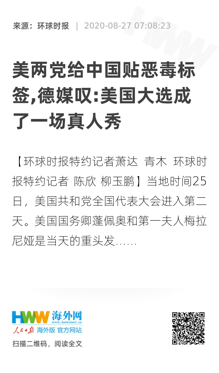 【环球时报特约记者萧达 青木 环球时报特约记者 陈欣 柳玉鹏】当地时间25日,美国共和党全国代表大会进入第二天。美国国务卿蓬佩奥和第一夫人梅拉尼娅是当天的重头发言人。蓬佩奥不顾国内舆论强烈质疑,跨过外交部门和政党竞争之间的传统界限,在提前录制的视频中卖力吹捧特朗普所谓“外交成就”,甚至给他戴上“唯一能与中国较量的人”的高帽。蓬佩奥有关中国的说法被美媒打上“不实”标签,《华盛顿邮报》则发出警告称,“中国挑战”已经被美国两党高度政治化滥用。在共和党全国代表大会前两日的各种发言中,“中国病毒”一词被频繁使用,对中国的攻击更不鲜见。会场之外,陷入比强硬竞赛的民主党总统候选人拜登团队有人竟宣称,中国对待维吾尔族穆斯林的做法是“种族灭绝”。对中国无底线抹黑,极尽所能地妖魔化对手,让政府权力服务党派竞争……德国《柏林日报》感叹,本应向世界展示民主的美国大选,已然成了一场真人秀。