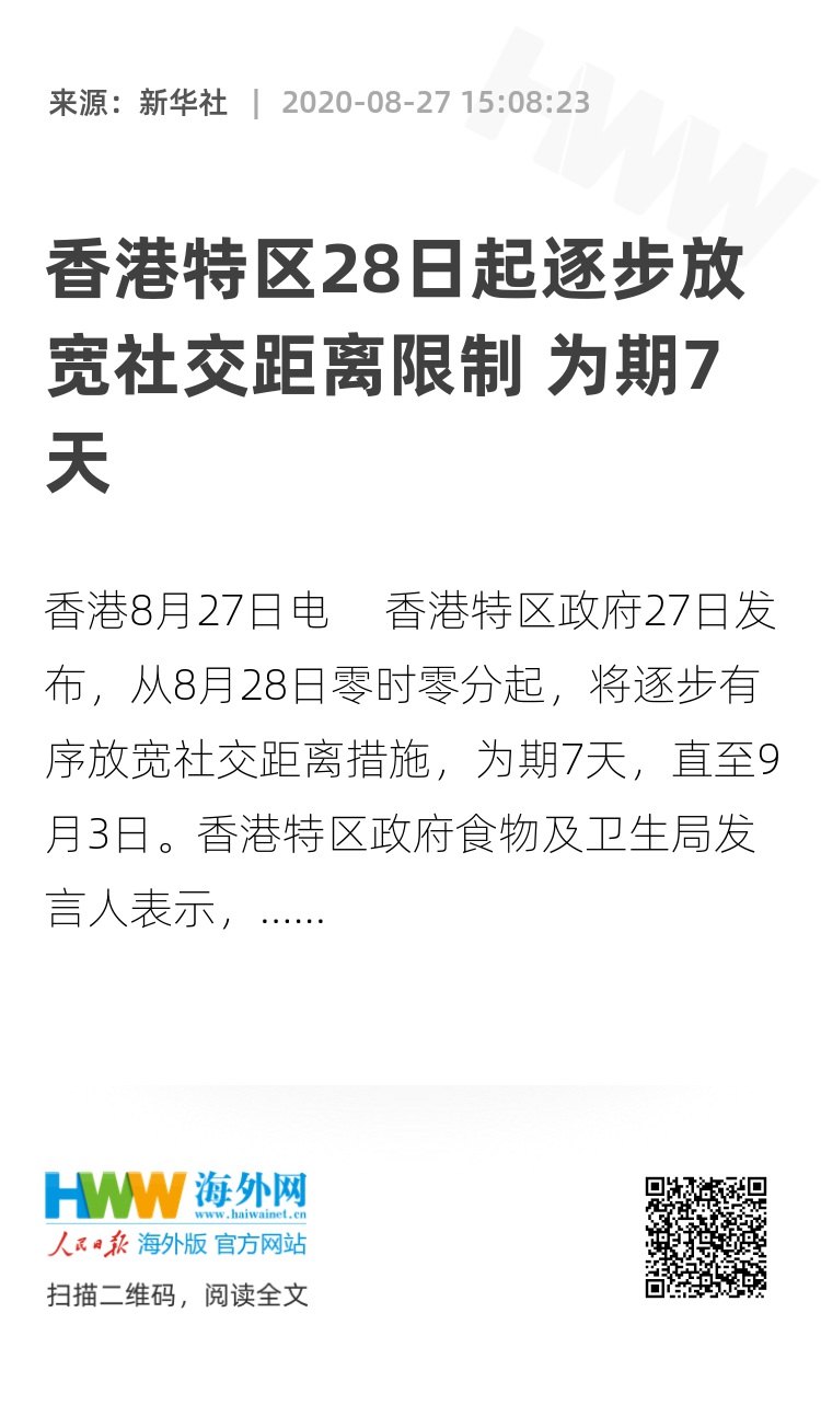 新华社香港8月27日电 香港特区政府27日发布,从8月28日零时零分起,将逐步有序放宽社交距离措施,为期7天,直至9月3日。