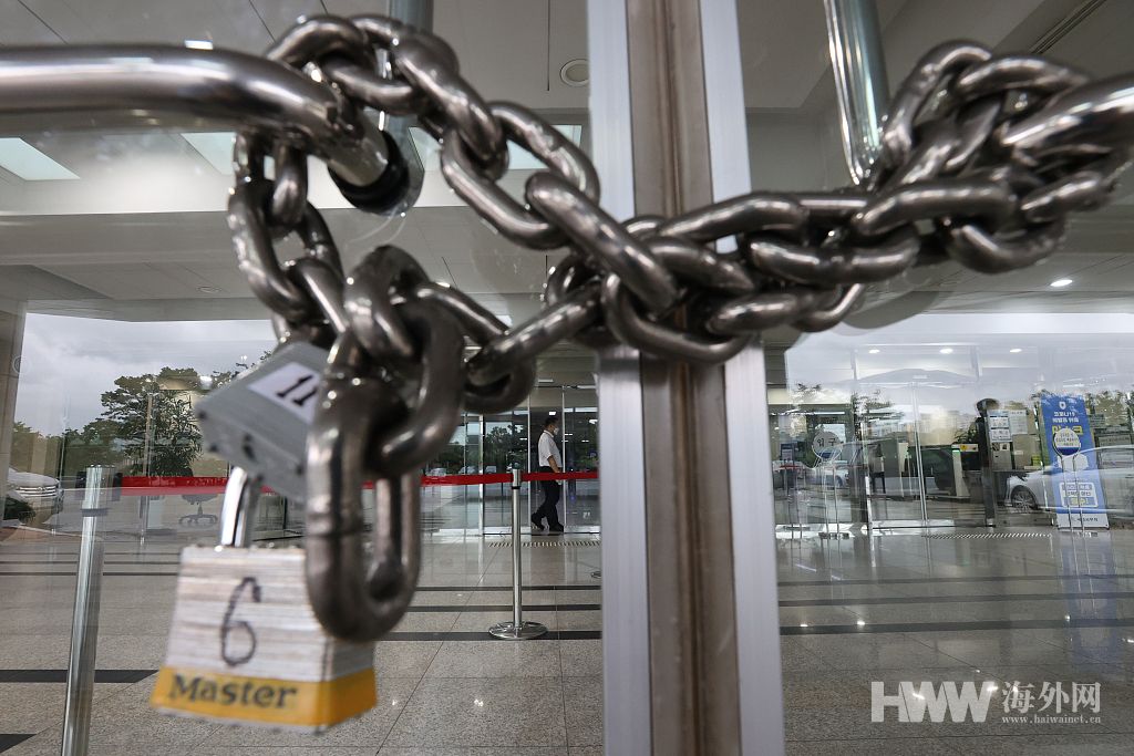 当地时间2020年8月27日,韩国首尔,国会被封。韩国执政党共同民主党一名跑口记者26日确诊新冠肺炎后,国会议事堂27日将被封锁一天,包括共同民主党党首李海瓒在内的多人将自我隔离,预计这将影响到国会和执政党的正常活动。(供图:CFP)
