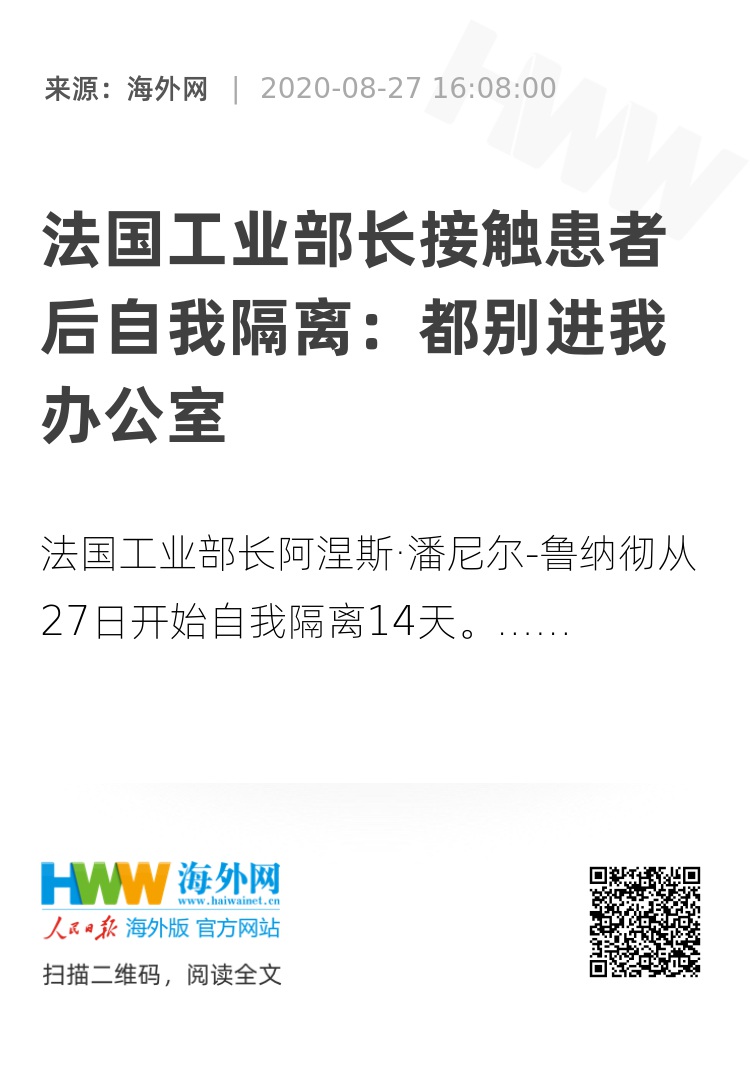 海外网8月27日电 法国工业部长阿涅斯·潘尼尔-鲁纳彻27日宣布,因为自己曾接触过一名新冠肺炎患者,她将接受检测并开始自我隔离14天。