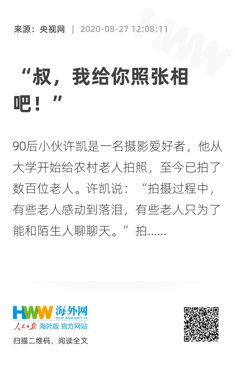 90后小伙许凯是一名摄影爱好者,他从大学开始给农村老人拍照,至今已拍了数百位老人。