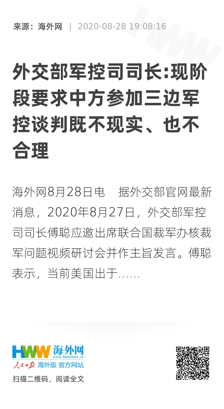 海外网8月28日电 据外交部官网最新消息,2020年8月27日,外交部军控司司长傅聪应邀出席联合国裁军办核裁军问题视频研讨会并作主旨发言。