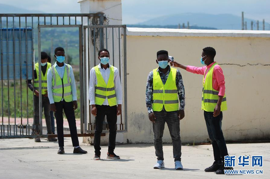 8月26日,在埃塞俄比亚首都亚的斯亚贝巴附近的亚吉铁路英多得车站货场,工作人员接受体温检测。 新华社发(唐勇成摄)