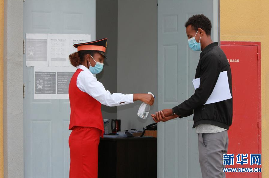 8月26日,在埃塞俄比亚首都亚的斯亚贝巴郊外的亚吉铁路莫角车站,工作人员进行手部消毒。 新华社发(唐勇成摄)