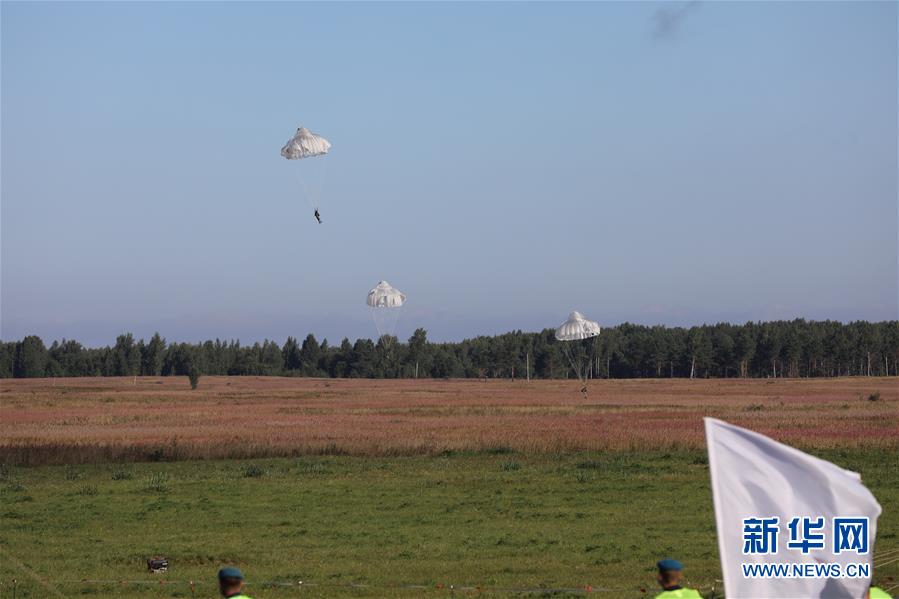 8月24日,在俄罗斯基斯洛沃空降场展开的“空降排”项目中,中国参赛官兵进行“空降集结与急行军”课目比赛时空降着陆。 新华社发(帅少鹏 摄)