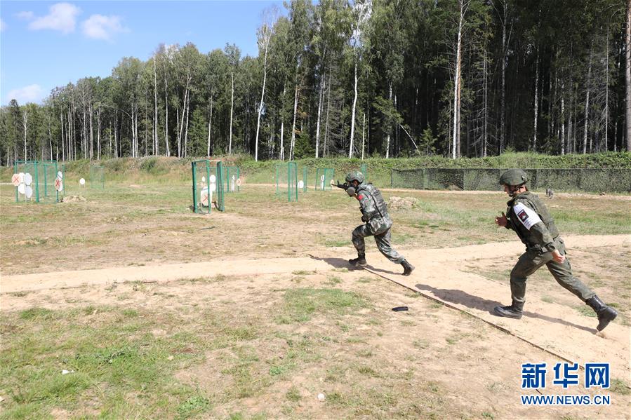 8月25日,在俄罗斯科斯特罗马市三防学院举行的“安全环境”项目中,中国参赛官兵(左)战斗着装、戴防毒面具进行“战斗侦察”射击课目的赛前训练。新华社发(傅道永 摄)