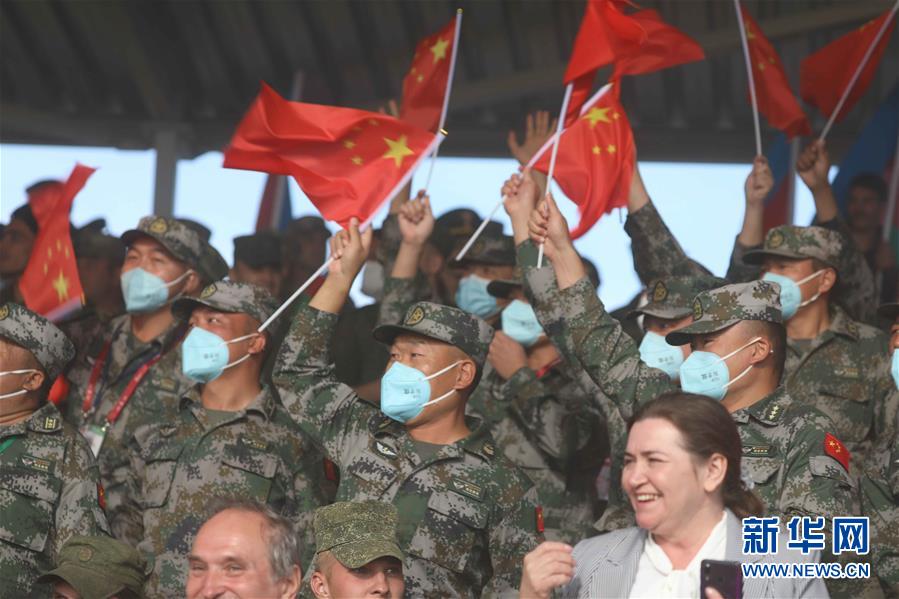 8月23日,在俄罗斯阿拉比诺举行的“坦克两项”项目比赛现场,观战官兵为中国参赛队加油。新华社发(荆海辉 摄)