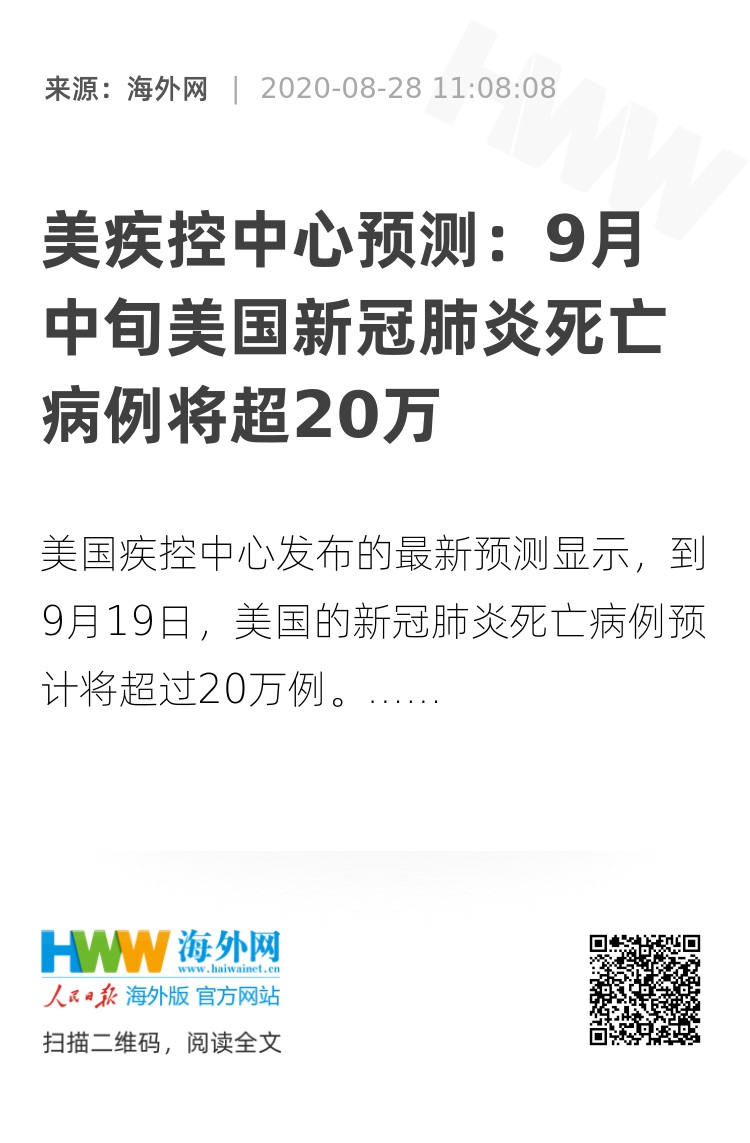 海外网8月28日电 美国疾病控制与预防中心发布的最新预测显示,到9月19日,美国的新冠肺炎死亡病例预计将超过20万例。