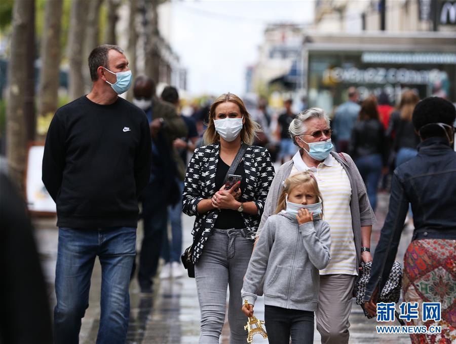 8月28日上午,人们戴口罩走在法国巴黎香榭丽舍大街。 新华社记者 高静 摄