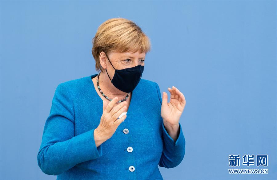 8月28日,在德国首都柏林,德国总理默克尔在夏季记者会后佩戴口罩准备离开。 新华社记者 任珂 摄