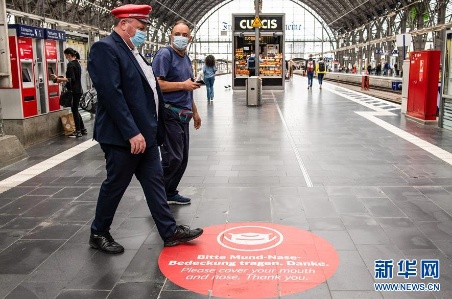 这是8月29日在德国法兰克福的火车站内拍摄的戴口罩的工作人员。 7月末以来,随着大批境外度假人员归国,德国疫情出现强势反弹,每日新增病例从1000例以下一度增至2000多例。德国总理默克尔8月27日与各联邦州州长召开视频会议,并决定调整新冠防疫措施,加大对不遵守防疫规定者的处罚力度,以应对夏末的疫情反弹势头。 新华社发(凯文·福格特摄)