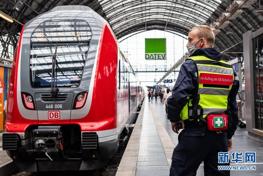 这是8月29日在德国法兰克福的火车站内拍摄的一名戴口罩的安全人员。 7月末以来,随着大批境外度假人员归国,德国疫情出现强势反弹,每日新增病例从1000例以下一度增至2000多例。德国总理默克尔8月27日与各联邦州州长召开视频会议,并决定调整新冠防疫措施,加大对不遵守防疫规定者的处罚力度,以应对夏末的疫情反弹势头。 新华社发(凯文·福格特摄)