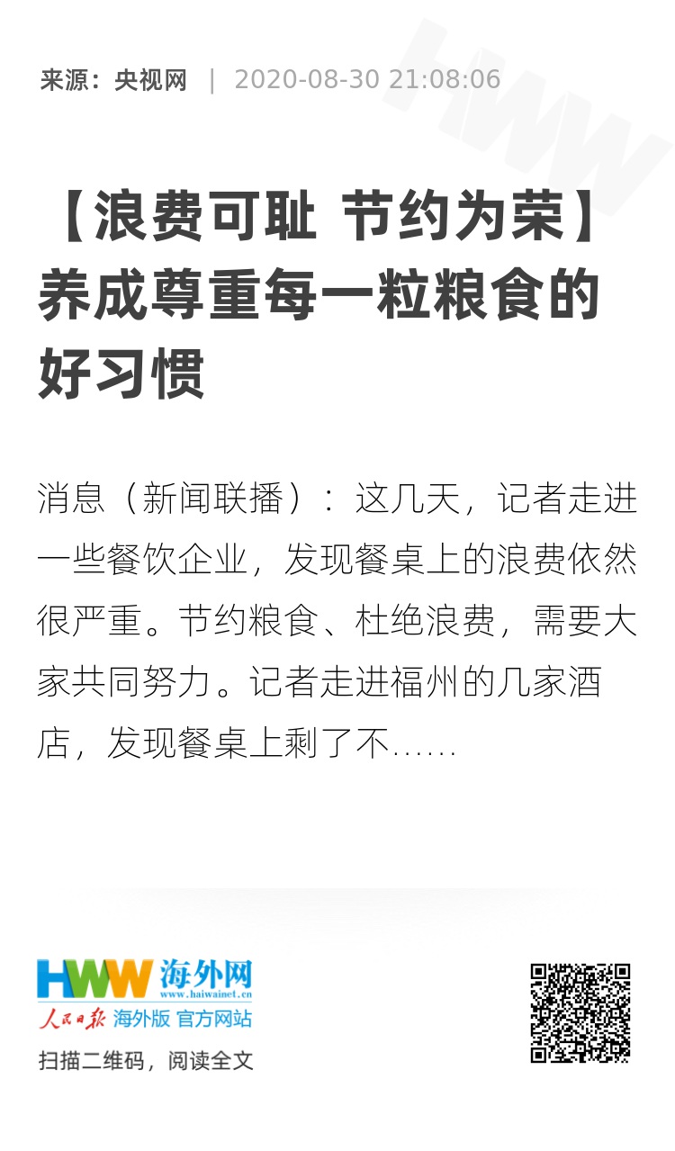 央视网消息(新闻联播):这几天,记者走进一些餐饮企业,发现餐桌上的浪费依然很严重。节约粮食、杜绝浪费,需要大家共同努力。