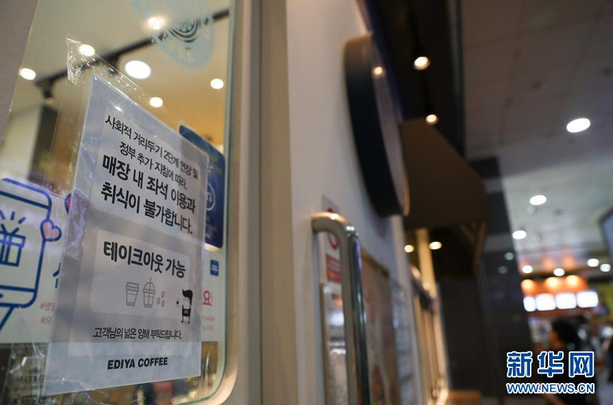 8月30日,在韩国首尔,一家连锁咖啡店挂出禁止堂食只能外卖的告示。 针对近期首尔、仁川、京畿道等韩国首都圈地区疫情持续蔓延的趋势,韩国政府决定在继续维持保持社交距离第二阶段政策的同时,对首都圈进一步采取强化防疫措施。自8月30日起至9月6日,位于首都圈的餐厅、糕点店等每天21时后禁止堂食,连锁型咖啡店内不分时间段均禁止堂食;健身房、台球厅、室内高尔夫练习场等室内体育设施暂停营业;首都圈补习班暂停面对面授课,但在遵守防疫规则前提下,9人以下补习班可在申报获批的指定场所继续运营。 新华社记者 王婧嫱 摄