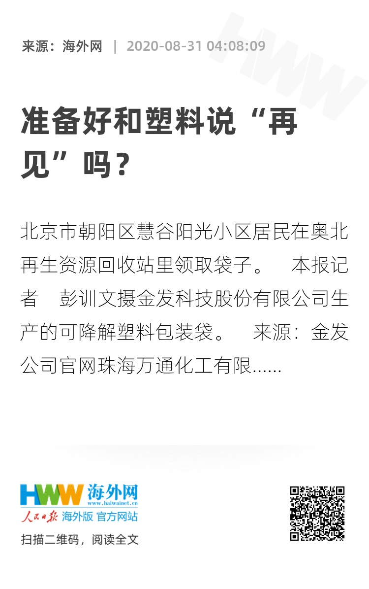 金发科技股份有限公司生产的可降解塑料包装袋。 来源:金发公司官网