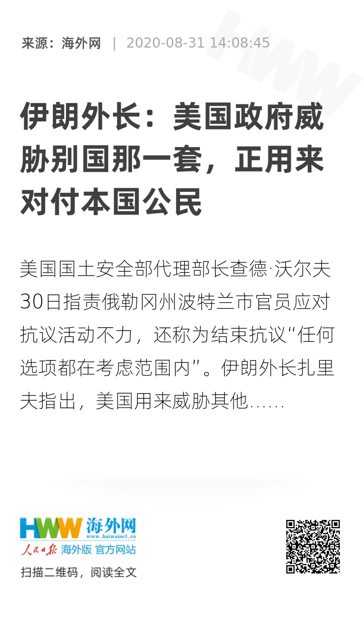 海外网8月31日电 美国国土安全部代理部长查德·沃尔夫30日指责俄勒冈州波特兰市官员应对抗议活动不力,还表示为结束抗议“任何选项都在考虑范围内”。对此,伊朗外长扎里夫指出,美国用来威胁其他国家的“不排除任何选项”政策,现在正被用来对付自己的公民。