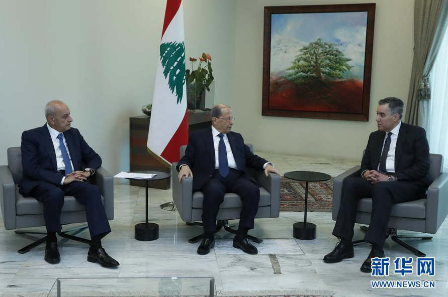 8月31日,黎巴嫩总统米歇尔·奥恩(中)、议长纳比·贝里(左)和新总理穆斯塔法·阿迪卜在贝鲁特东南的总统府会面。黎巴嫩总统米歇尔·奥恩8月31日任命穆斯塔法·阿迪卜为新总理,并授权其组阁。黎巴嫩首都贝鲁特港口区8月4日发生剧烈爆炸,导致至少190人死亡、6500多人受伤。时任总理哈桑·迪亚卜8月10日宣布政府集体辞职。新华社发(黎巴嫩官方摄影机构达拉提和努赫拉供图)