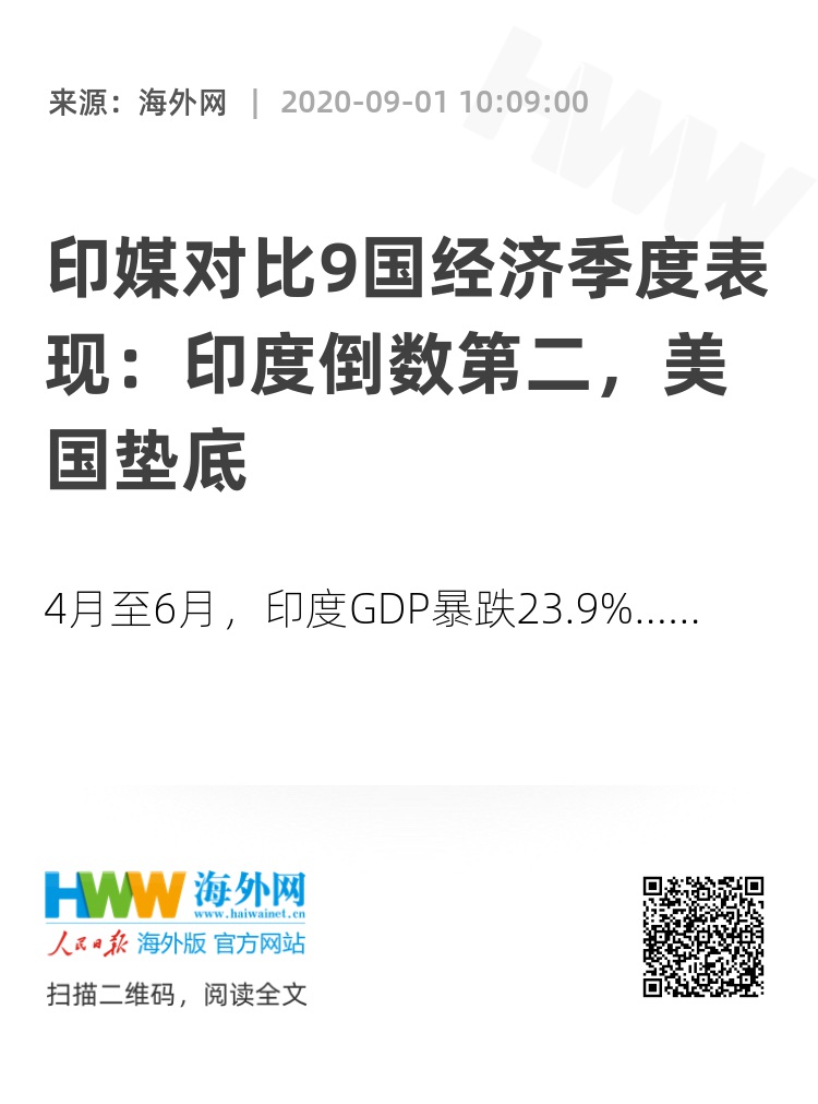 海外网9月1日电 受新冠肺炎疫情等因素影响,印度4月至6月的季度GDP暴跌23.9%。印媒称,印度在这一季度的经济表现是全球倒数第二,美国倒数第一。