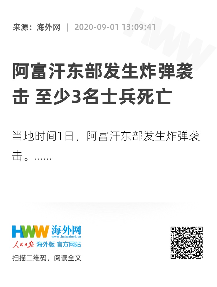 海外网9月1日电 当地时间1日,阿富汗东部发生炸弹袭击,造成3名士兵死亡,5人受伤。