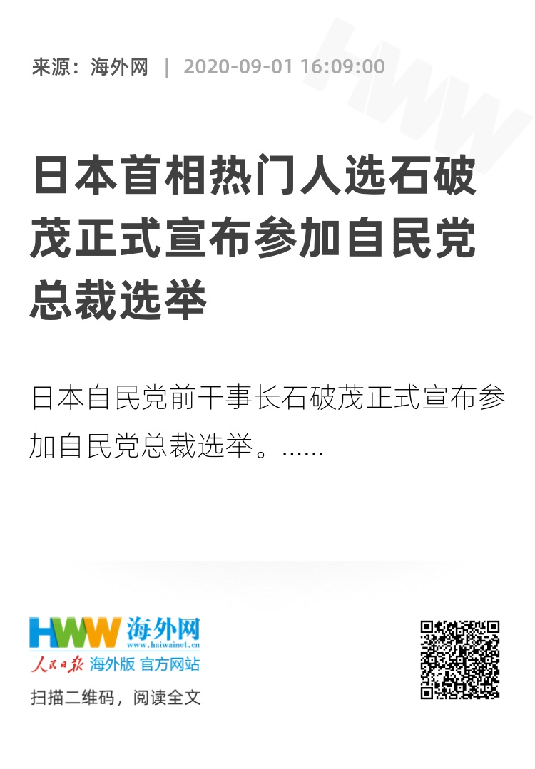 目前,正式宣布参选的有前外相岸田文雄,而热门人选之一的河野宣布不参加选举。内阁官房长官菅义伟则将于2日宣布参选,他目前已获得党内约六成议员的支持,处于优势。日媒分析称,石破在日本地方很受欢迎,但目前的选举形式对其不利,日本政界也有声音指出他应该放弃参选。