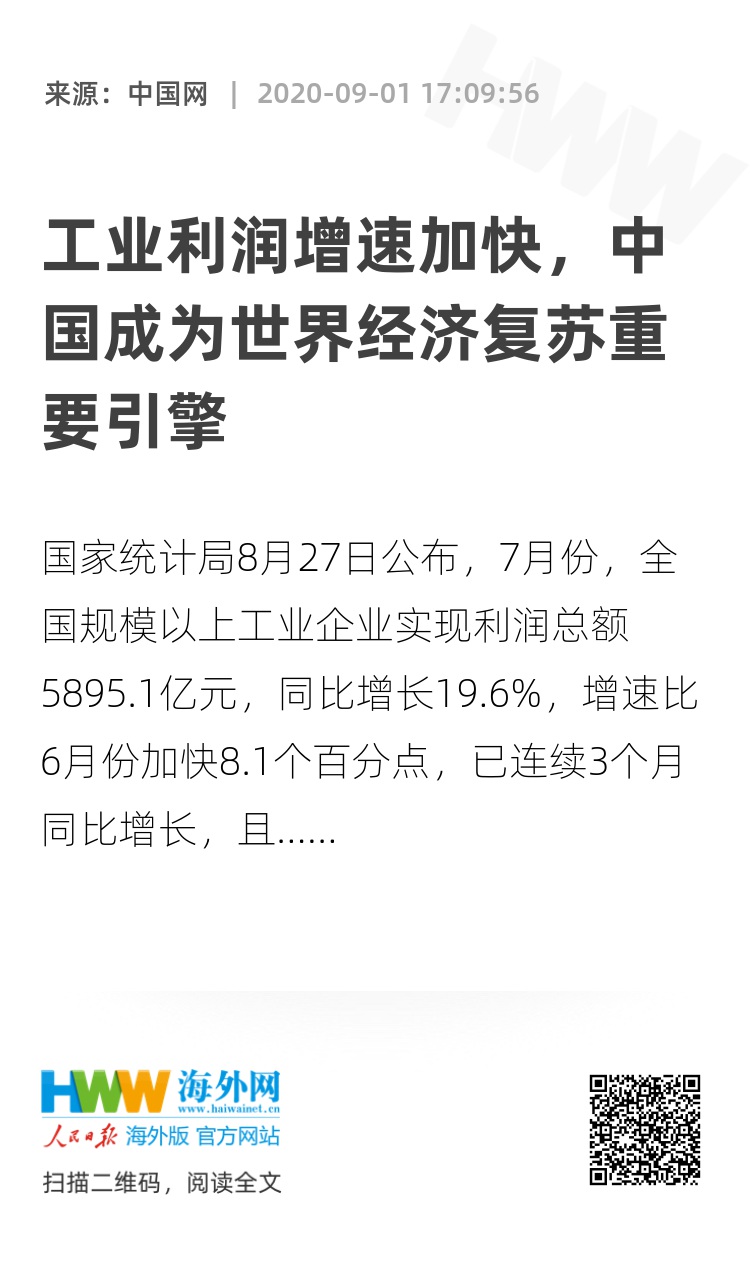 工业是经济的牛头,工业强劲复苏会带领服务业、农业走向复苏,整体经济加速复苏的步伐已较为确定。虽然受疫情影响,一季度GDP同比下降6.8%,但二季度GDP增速实现由负转正,二季度增长3.2%。对比之下,美国二季度GDP暴跌34.8%;日本二季度GDP下降27.8%。穆迪8月25日发布的《全球宏观展望报告》将2020年中国GDP增长预期从此前的1%上调至1.9%。中国是穆迪上调2020年增长预期的唯一国家。穆迪预计今年全球GDP萎缩4.6%,除了中国以外,20国集团所有经济体的经济今年都会下降。随着积极财政政策的实施以及央行加大对各类市场主体的金融支持,二季度以来,工业生产和固定资产投资强劲复苏,与疫情相关的需求增加也带动了出口。随着人们重返工作岗位,居民收入有所提高,消费需求也得到了促进。中国经济的强劲表现表明,中国成为带动世界经济走向复苏的重要引擎。