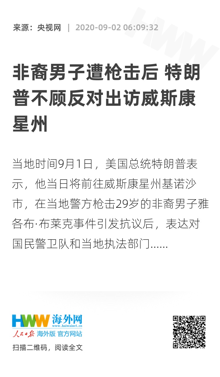 当地时间9月1日,美国总统特朗普表示,他当日将前往威斯康星州基诺沙市,在当地警方枪击29岁的非裔男子雅各布·布莱克事件引发抗议后,表达对国民警卫队和当地执法部门的支持。
