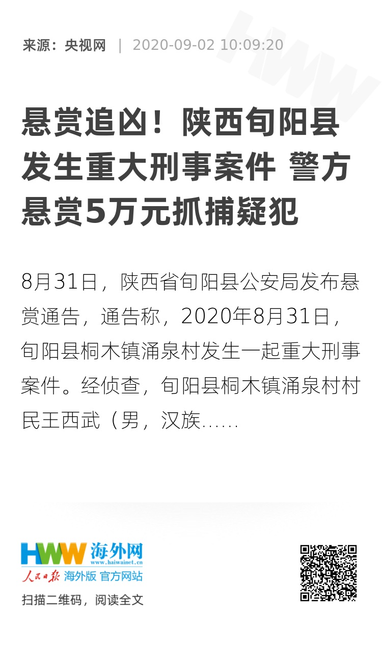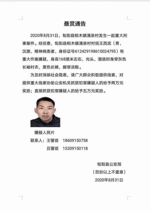 8月31日,陕西省旬阳县公安局发布悬赏通告,通告称,2020年8月31日,旬阳县桐木镇涌泉村发生一起重大刑事案件。