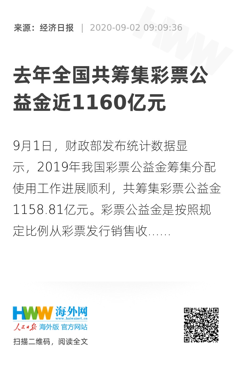 9月1日,财政部发布统计数据显示,2019年我国彩票公益金筹集分配使用工作进展顺利,共筹集彩票公益金1158.81亿元。