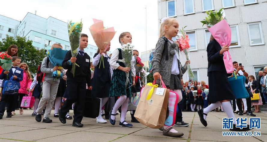 9月1日,在白俄罗斯首都明斯克,手持鲜花的一年级小学生参加开学典礼。 当日,白俄罗斯迎来开学季。 新华社发(任科夫 摄)