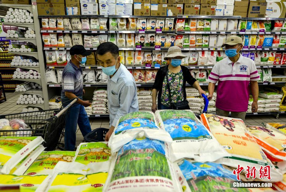9月2日,新疆乌鲁木齐市青年路好家乡超市,民众采购日常所需的物品。据介绍,该市各大商超正在按照复工复产的要求,进行全面消杀及货物调运工作,随后将陆续恢复营业。 中新社记者 刘新 摄