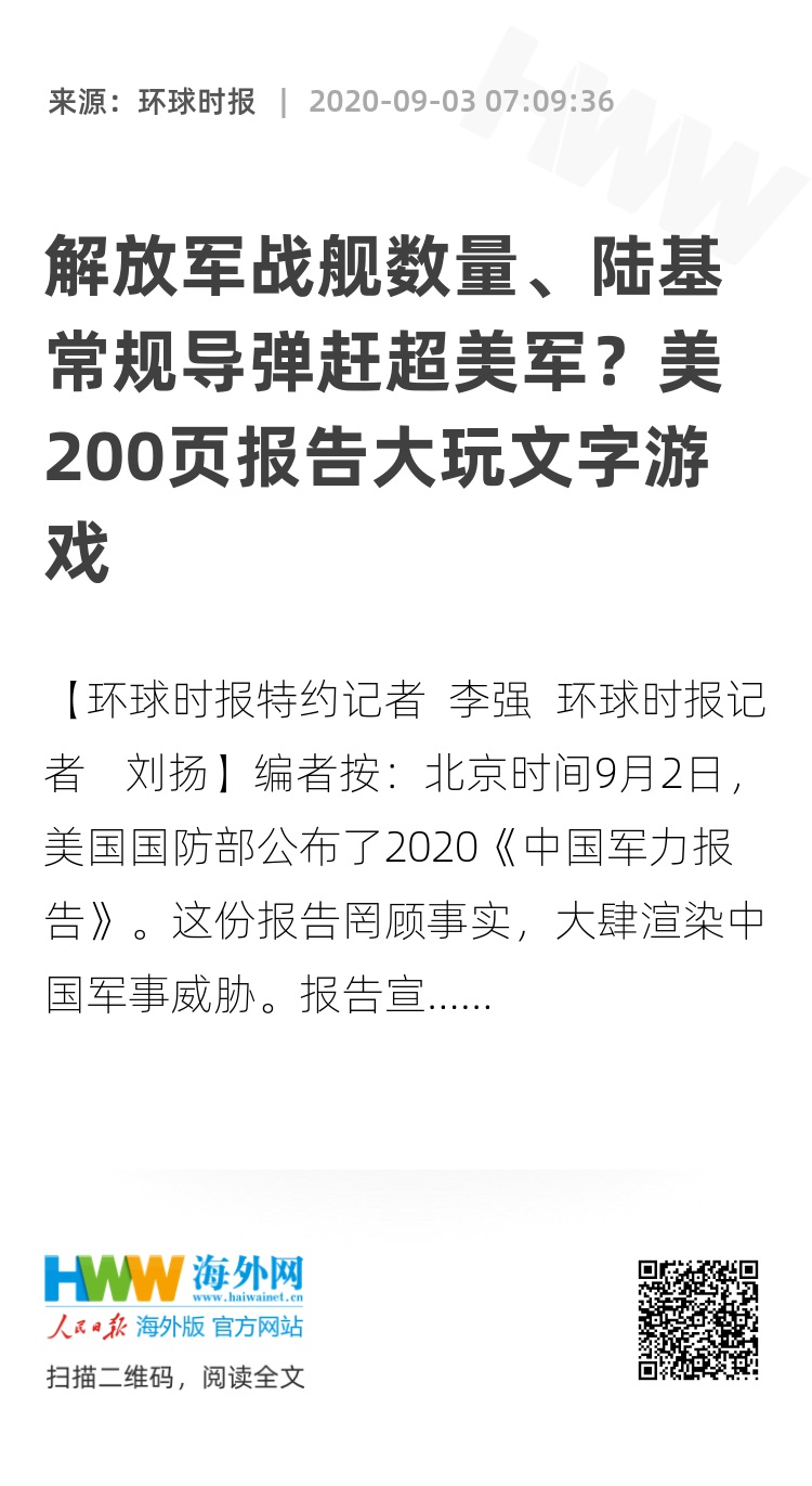 【环球时报特约记者 李强 环球时报记者 刘扬】编者按:北京时间9月2日,美国国防部公布了2020《中国军力报告》。这份报告罔顾事实,大肆渲染中国军事威胁。报告宣称中国在海军规模、陆基中程中远程导弹和综合防空系统领域已经赶超美国,而且解放军实力远超台军。不过中国专家认为,报告中的很多对比,只是玩文字游戏,但颇具蛊惑性。