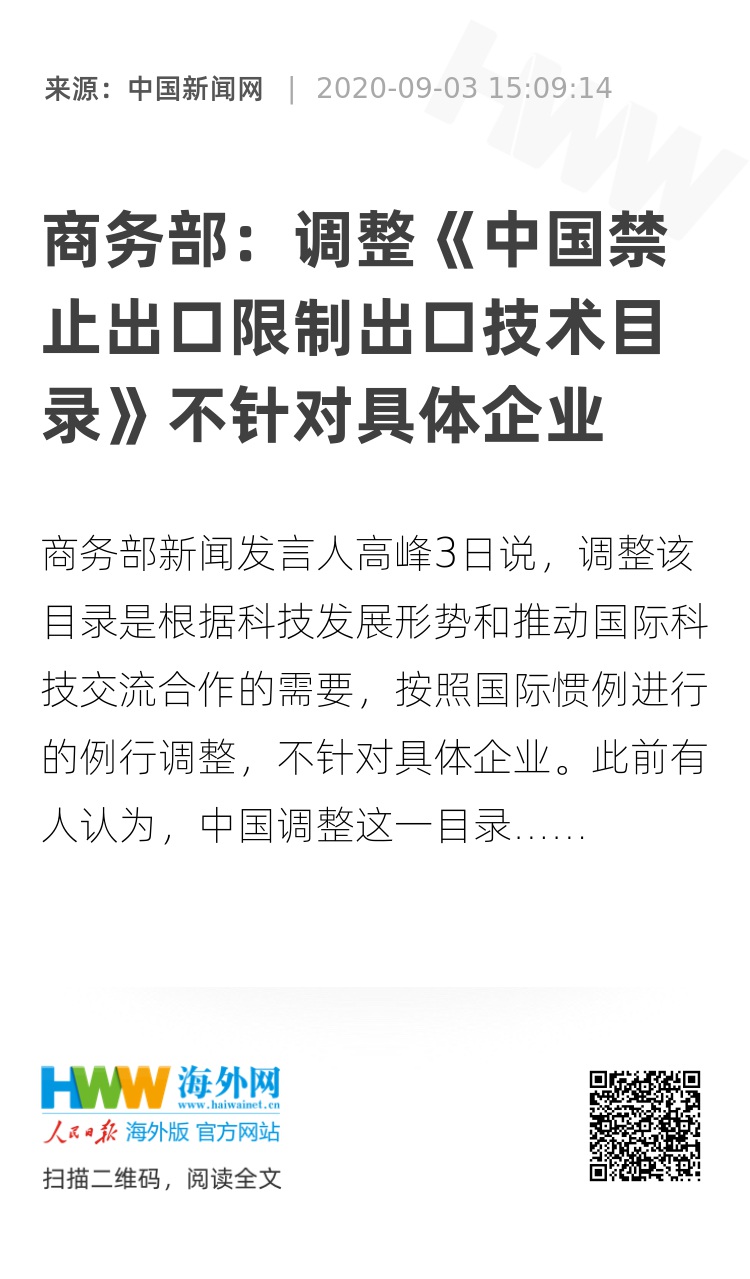 商务部新闻发言人高峰3日说,调整该目录是根据科技发展形势和推动国际科技交流合作的需要,按照国际惯例进行的例行调整,不针对具体企业。此前有人认为,中国调整这一目录是为了拖延字节跳动公司出售Tiktok业务。(记者 李晓喻)