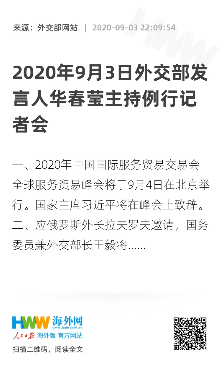 二、应俄罗斯外长拉夫罗夫邀请,国务委员兼外交部长王毅将出席于9月4日举行的金砖国家外长视频会晤。