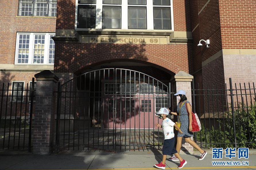 9月1日,行人从美国纽约一所公立学校外走过。 当天,纽约市长德布拉西奥宣布,纽约市公立学校系统原定9月10日的重开计划被推迟。 新华社记者 王迎 摄