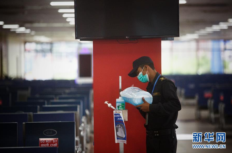 9月2日,一名安保人员在尼泊尔加德满都特里布万国际机场内补充洗手液。 受疫情影响,尼泊尔于3月下旬暂停国际、国内商业客运航班服务。9月1日,尼泊尔开始有限恢复国际商业航班客运服务,允许特定国家和地区的特定人群入境,但暂时不允许游客入境。 新华社发(苏拉韦·什雷斯塔摄)