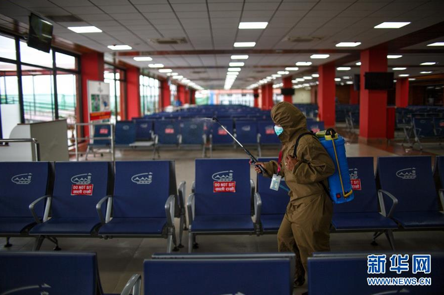 9月2日,一名工作人员在尼泊尔加德满都特里布万国际机场内喷洒消毒液。 受疫情影响,尼泊尔于3月下旬暂停国际、国内商业客运航班服务。9月1日,尼泊尔开始有限恢复国际商业航班客运服务,允许特定国家和地区的特定人群入境,但暂时不允许游客入境。 新华社发(苏拉韦·什雷斯塔摄)