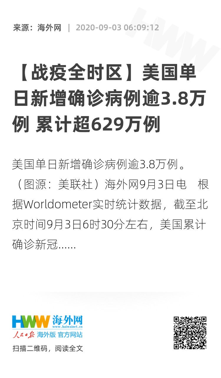 海外网9月3日电 根据Worldometer实时统计数据,截至北京时间9月3日6时30分左右,美国累计确诊新冠肺炎病例6295710例,累计死亡189883例。与前一日6时30分数据相比,美国新增确诊病例38139例,新增死亡病例983例。