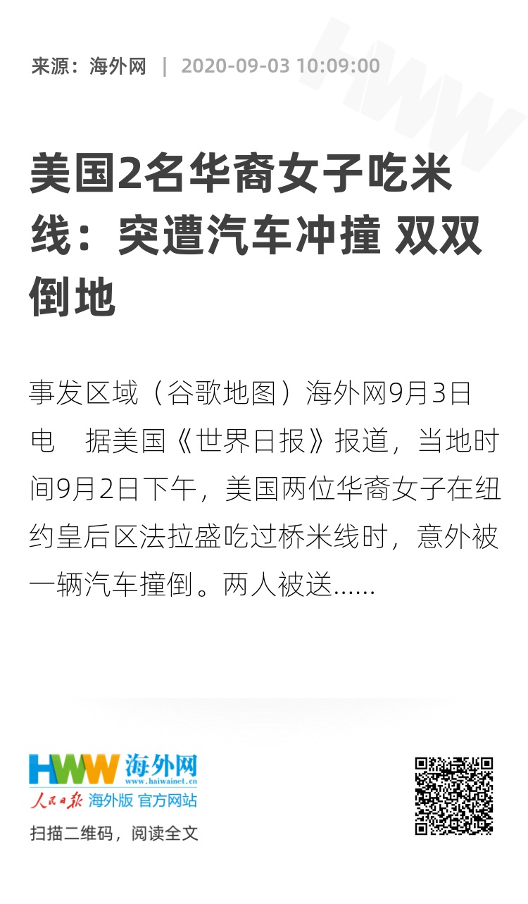 海外网9月3日电 据美国《世界日报》报道,当地时间9月2日下午,美国两位华裔女子在纽约皇后区法拉盛吃过桥米线时,意外被一辆汽车撞倒。两人被送院治疗,情况稳定,肇事司机则被警方开出出庭传票。