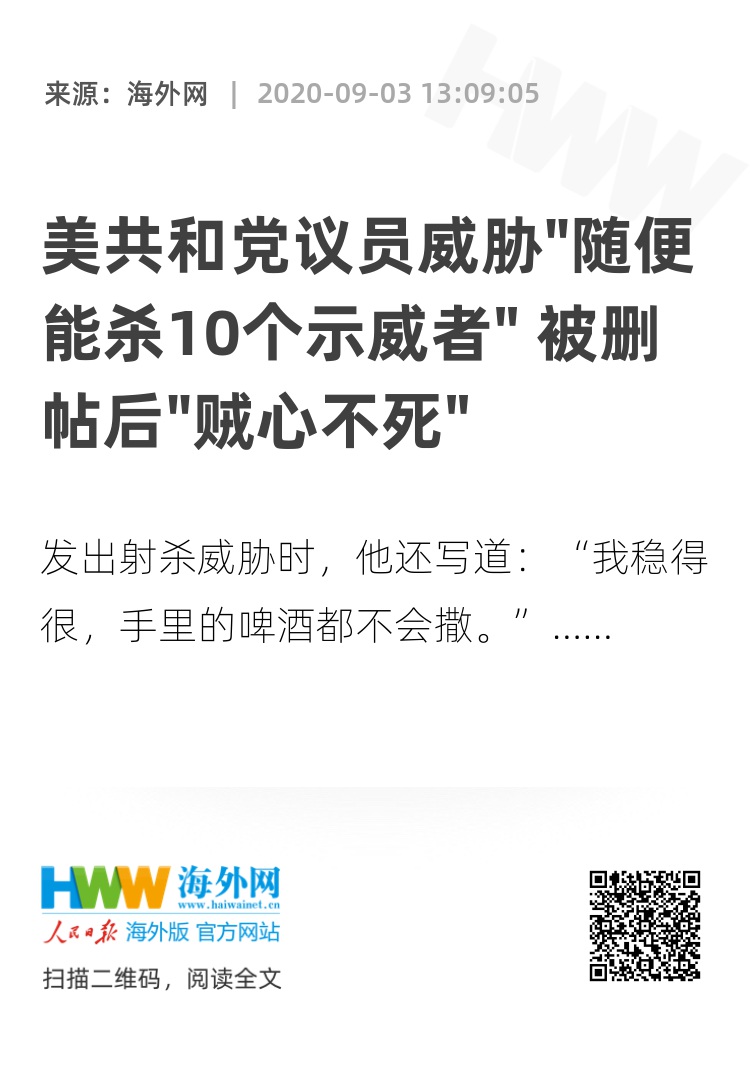 美媒表示,希金斯曾是联邦执法人员,长期呼吁拥护持枪权,还在美国步枪协会的宣传视频中出过镜。然而在文字中,希金斯没有提到有关暴力示威的任何内容,反而直接表示带枪上街的示威者会被视作威胁。发出射杀威胁时,他还写道:“我稳得很,手里的啤酒都不会撒。”