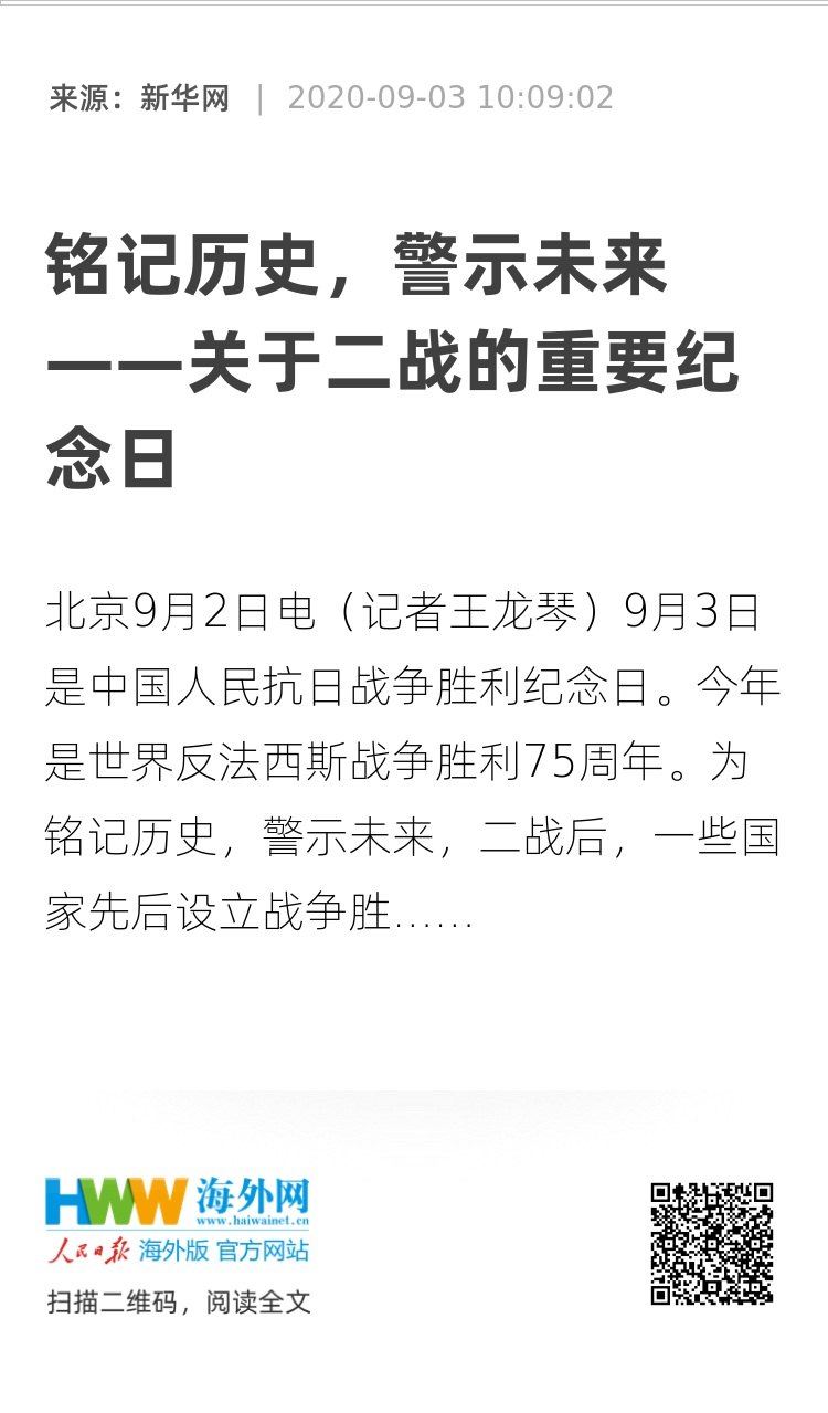 新华社北京9月2日电(记者王龙琴)9月3日是中国人民抗日战争胜利纪念日。今年是世界反法西斯战争胜利75周年。为铭记历史,警示未来,二战后,一些国家先后设立战争胜利日和死难者国家纪念日。这些纪念日主要包括: