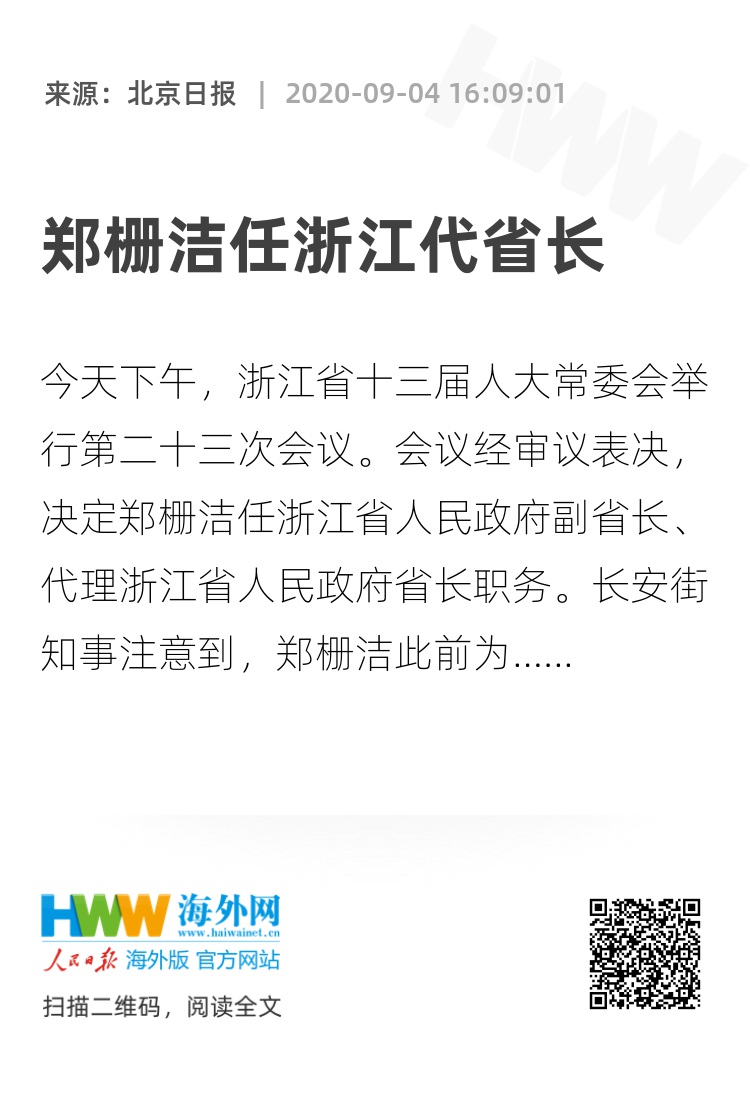 长安街知事注意到,郑栅洁此前为浙江省委副书记、宁波市委书记。