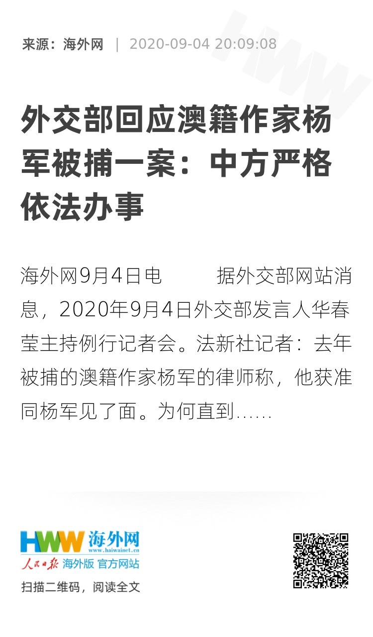 31869775,.外交部回应澳籍作家杨军被捕一案:中方严格依法办事,.2020-09-04 20:45:08,.204343,.张振