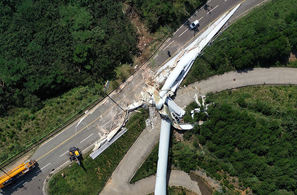 台风“美莎克”侵袭韩国 风力发电机拦腰折断