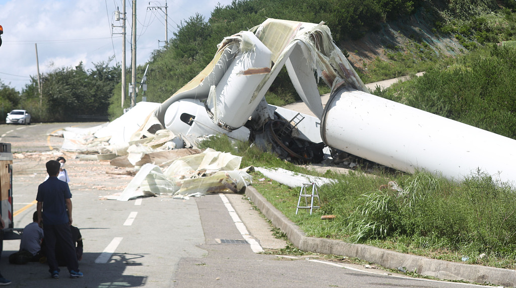 当地时间2020年9月3日,韩国庆尚南道,第9号台风“美莎克”过境带来强风,一台风力发电机遭到破坏。图片来源:视觉中国