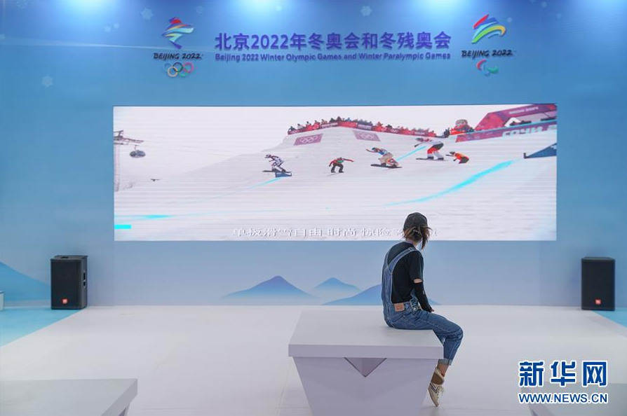 9月1日,在北京奥林匹克公园中轴景观大道室外展馆A馆内,一名女士在看冬季运动宣传片。  新华社记者 彭子洋 摄