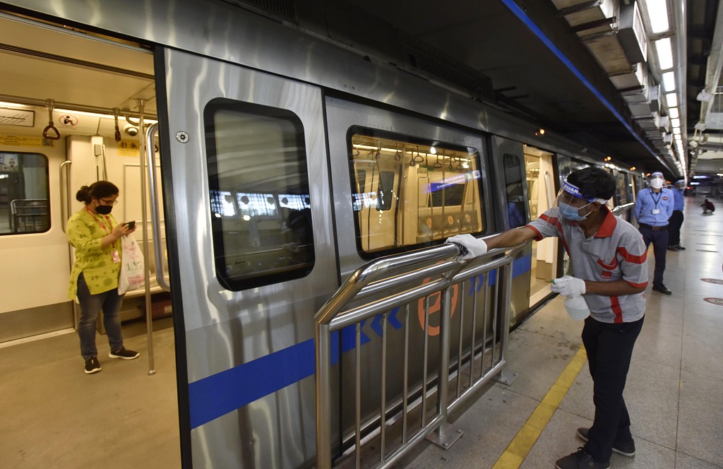 当地时间2020年9月3日,印度新德里,德里地铁举行媒体预览。德里地铁在经历了长达5个多月的封锁后,准备部分恢复运营。图片来源:视觉中国。