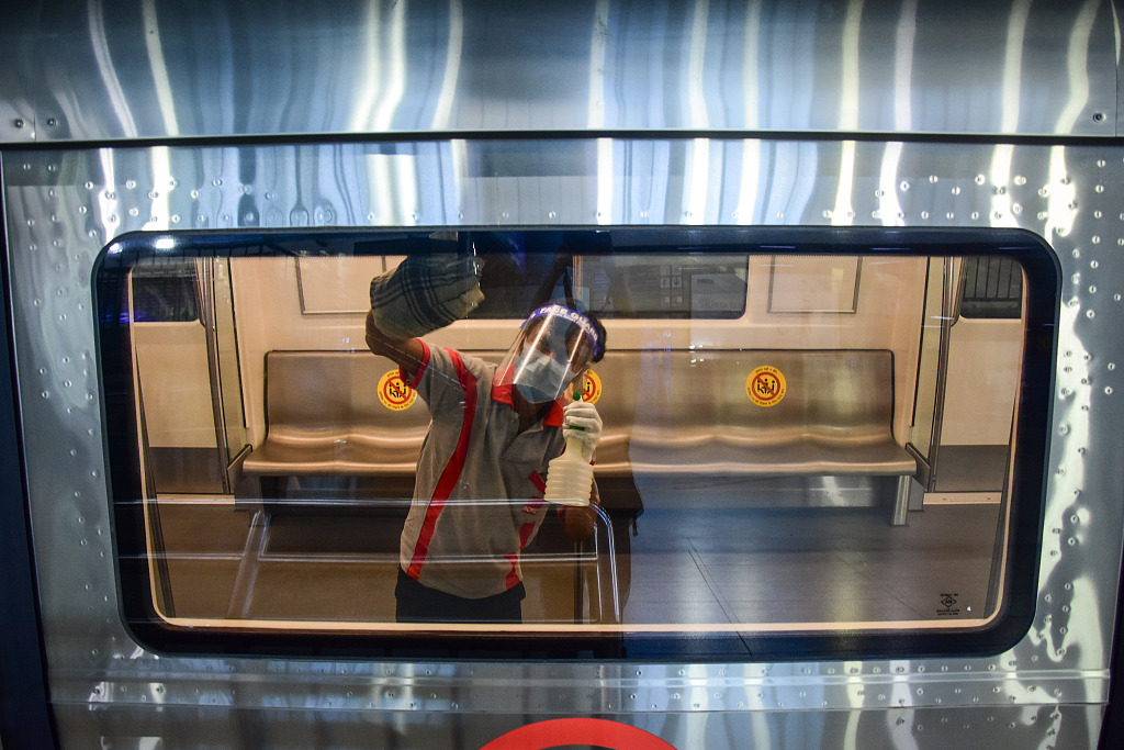 当地时间2020年9月3日,印度新德里,德里地铁举行媒体预览。德里地铁在经历了长达5个多月的封锁后,准备部分恢复运营。图片来源:视觉中国。