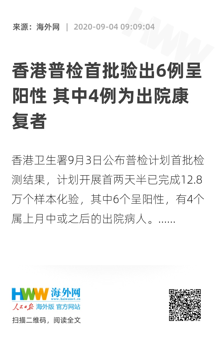 据香港《文汇报》报道,香港卫生署9月3日公布普检计划首批检测结果,计划开展首两天半已完成12.8万个样本化验,其中6个呈阳性,有4个属上月中或之后的出院病人。香港卫生防护中心传染病处主任张竹君表示,该4宗个案与其他已出院个案一样,体内均有抗体,且病毒指数较低,传染性低,并非二次感染,因此无须再次隔离和入院。