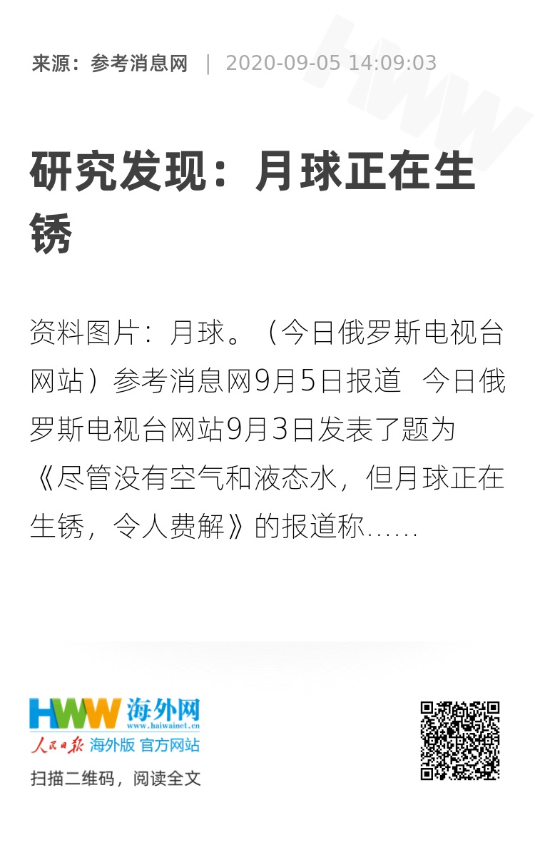 参考消息网9月5日报道 今日俄罗斯电视台网站9月3日发表了题为《尽管没有空气和液态水,但月球正在生锈,令人费解》的报道称,在对地球的天然卫星月球进行一连串新的探测任务之前,研究人员在月球表面发现了一个奇怪而意外的异常现象:没有空气和液态水存在的月球正在生锈。