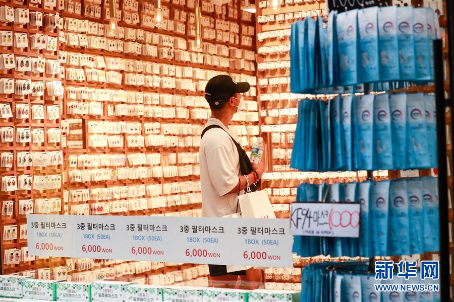 9月5日,一名戴口罩的男子在韩国首尔明洞一家饰品店选购商品,该饰品店门口摆放着待售卖的口罩。韩国政府4日宣布,将原定于本月6日结束的首都圈加强版防疫措施延长一周,同时继续在全国实施保持社交距离第二阶段政策直至本月20日,以加强构建防疫网络,保障现有医疗力量。 新华社记者 王婧嫱 摄
